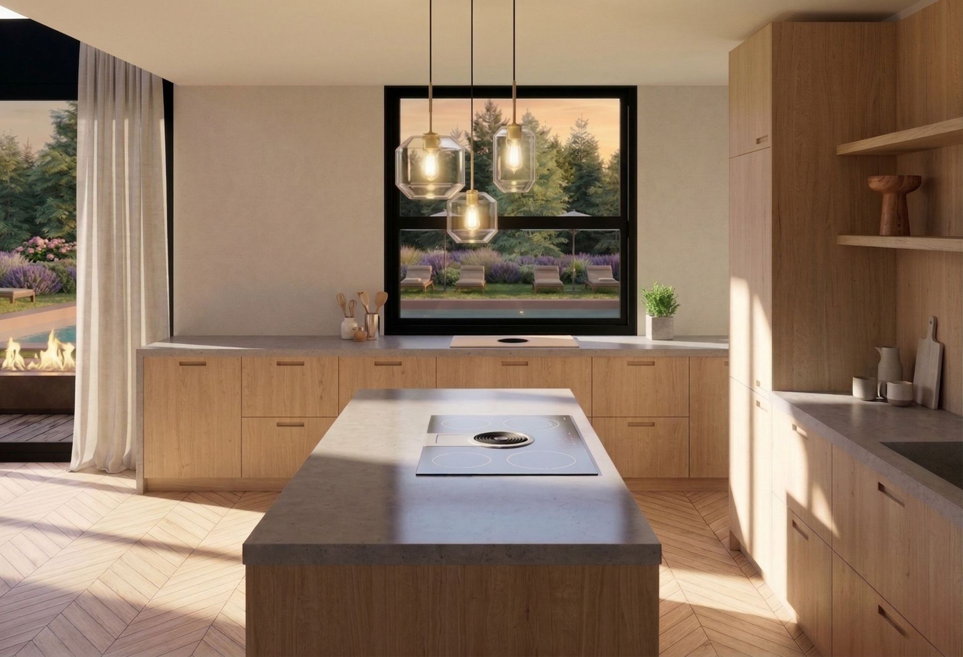 Expansive aluminum-framed glass panels introduce transparency and light, while thermally treated wood is used for outdoor decks and terraces. This combination of materials creates a durable, low-maintenance exterior with a strong visual presence, perfectly suited for modern mountain villa.