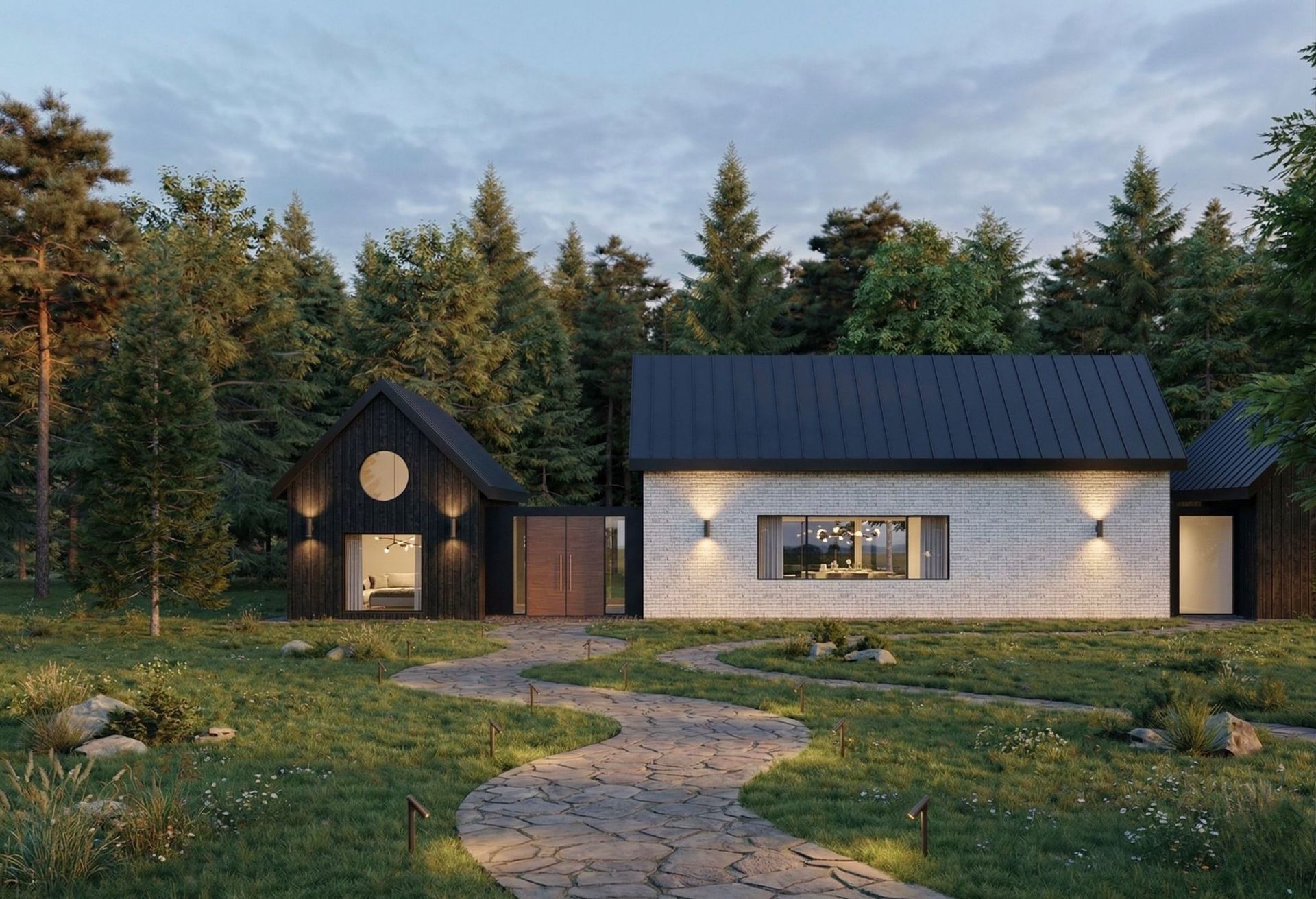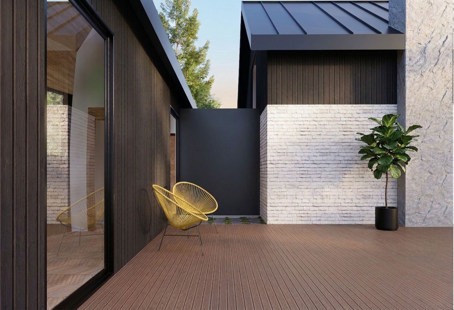 The home’s facade is a dynamic interplay of textures and tones. The pitched roof is clad in sleek, standing seam dark grey metal sheets. The primary exterior walls feature a striking combination of thermally treated light wood panels and brick siding. Adding an industrial touch, corten steel sheets line the passage walls. High-quality aluminum profile tempered glass is used for the expansive windows and sliding doors, while the outdoor decks utilize thermally treated wood panels supported by a pressure-treated lumber structure.