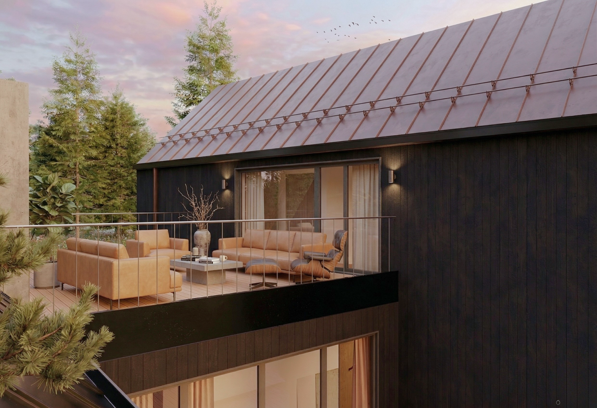 Outdoor decks and terraces are constructed using thermally treated wood, reinforcing the connection between the built form and the landscape. Inside, the material language continues with clean finishes and natural textures, creating a cohesive and timeless modern home in the Catskills.