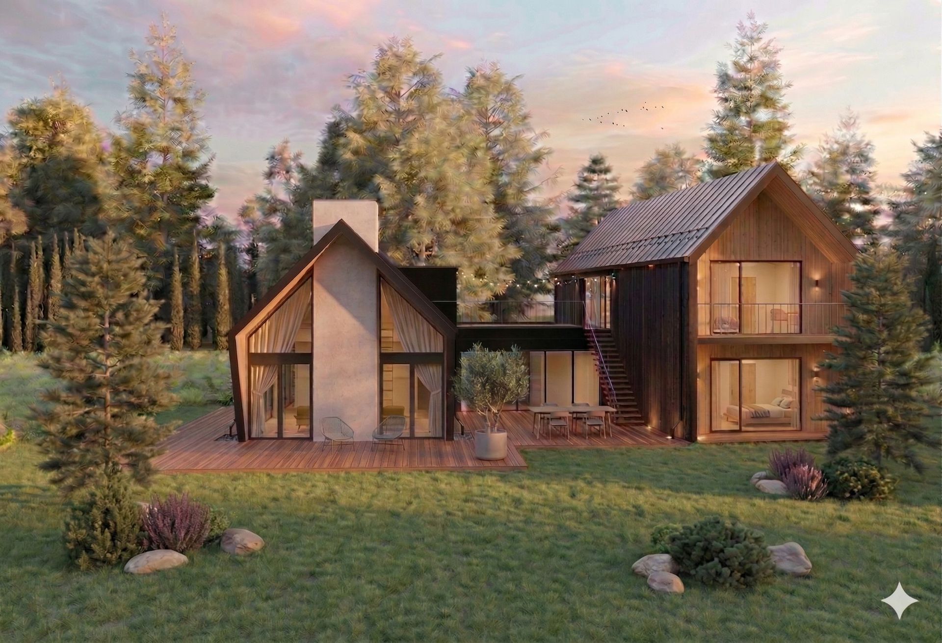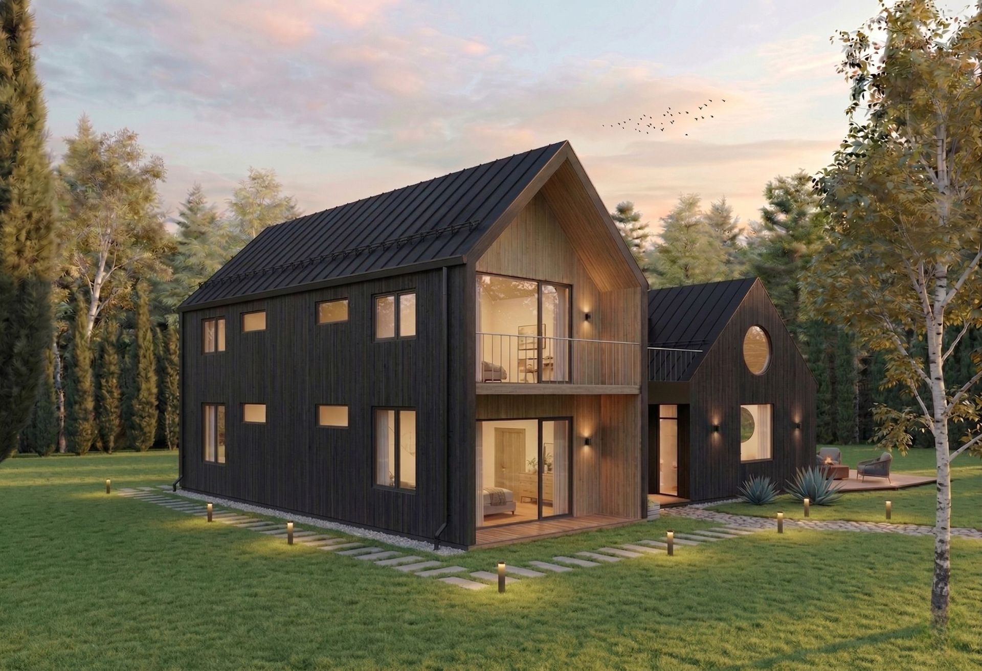 V House utilizes a refined palette of modern, durable materials that complement its natural surroundings. The exterior features a black standing-seam metal roof, expansive aluminum-framed glass panels, and thermally treated wood surfaces that add warmth and texture to the architectural composition.