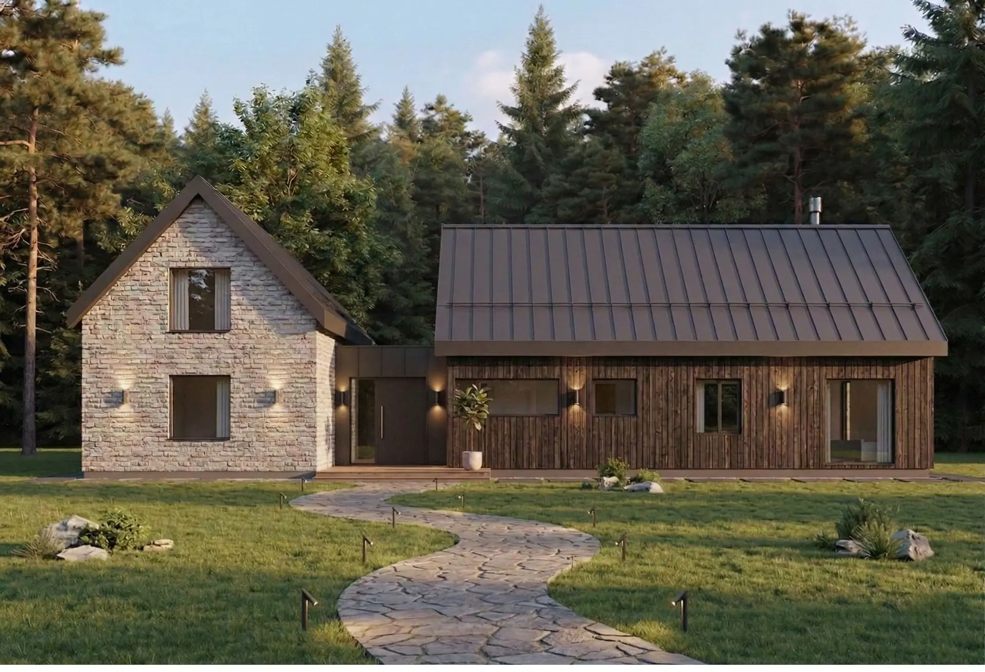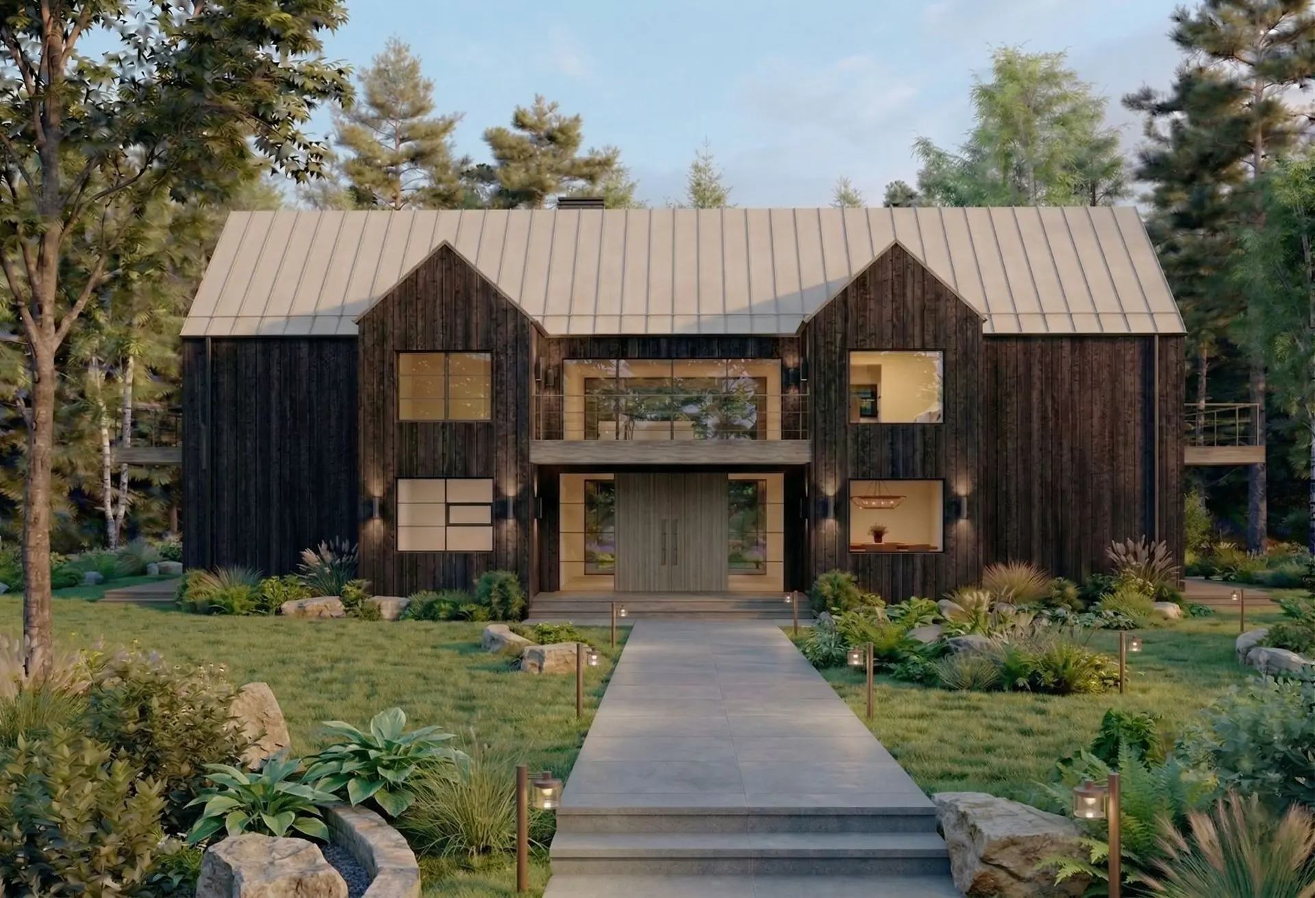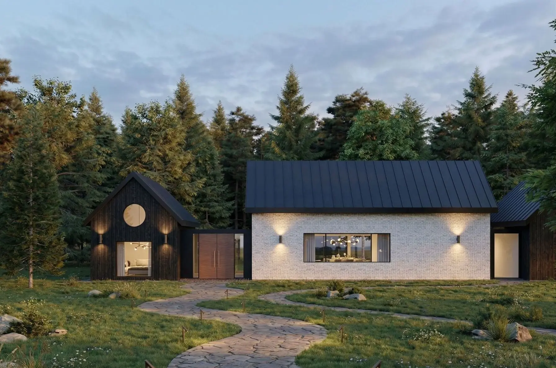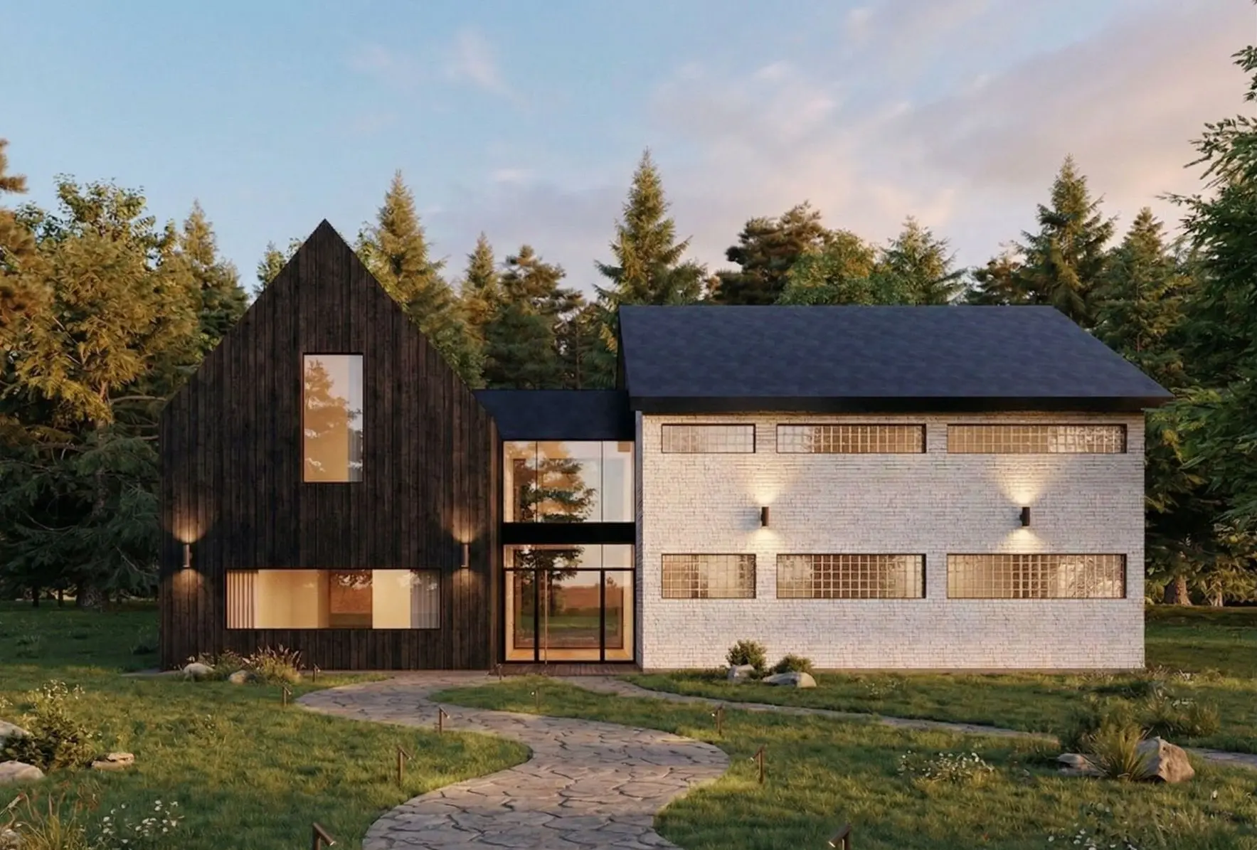 The Brickwood House is a 3,200-square-foot residence that exemplifies contemporary architecture through its modern barnhouse inspiration , organizing private and social areas into distinct volumes connected by a transparent glazed passageway.