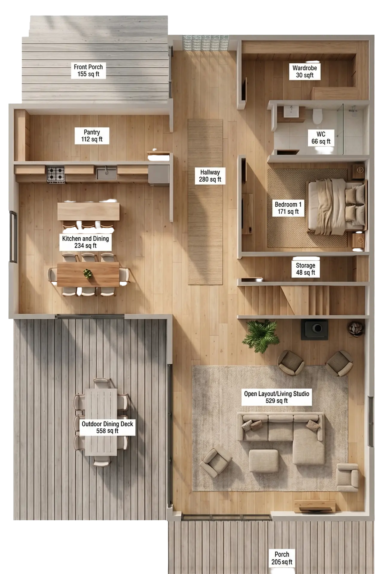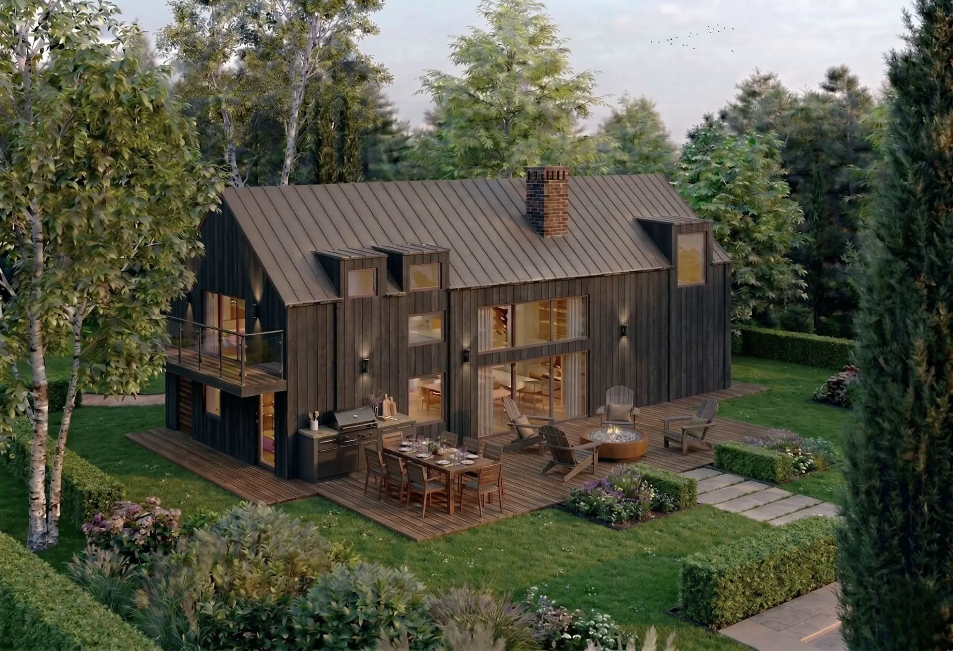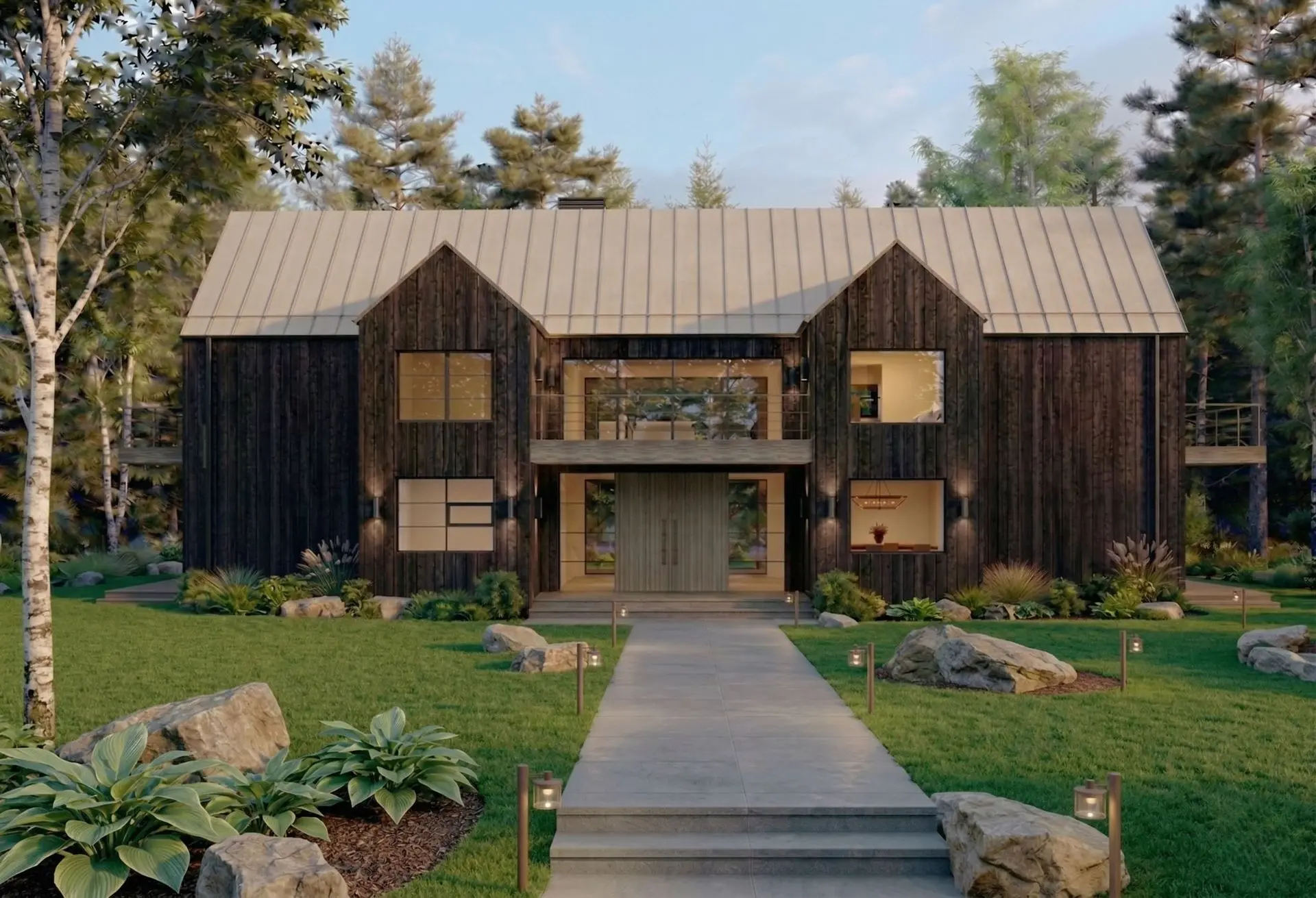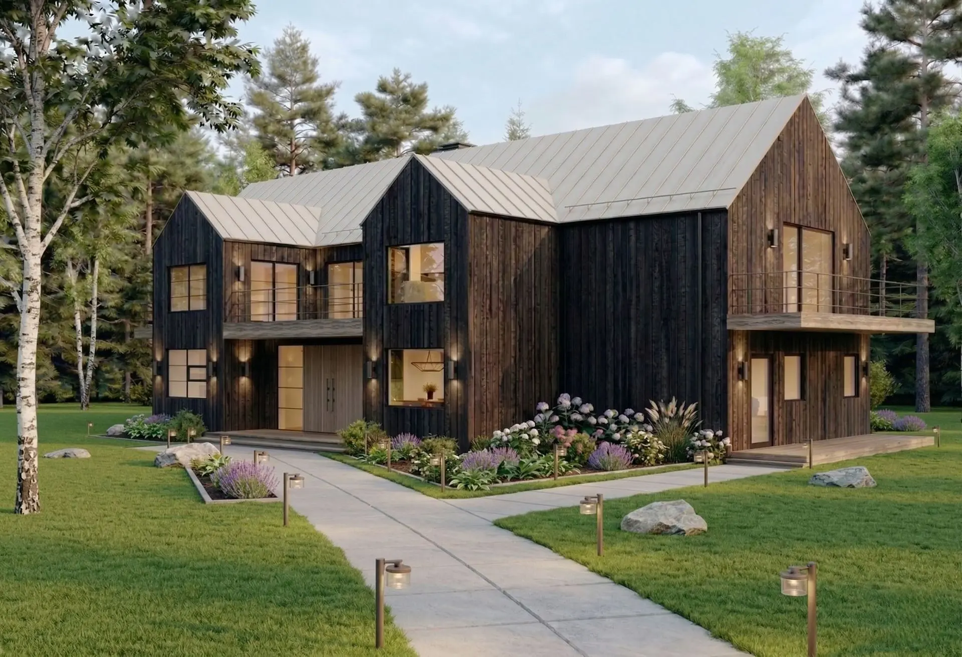 Blackwood House features a bold and cohesive material palette that reinforces its architectural identity. The exterior is defined by dark-stained or burnt wood vertical cladding, paired with a dark grey standing-seam metal roof and matching metal detailing.