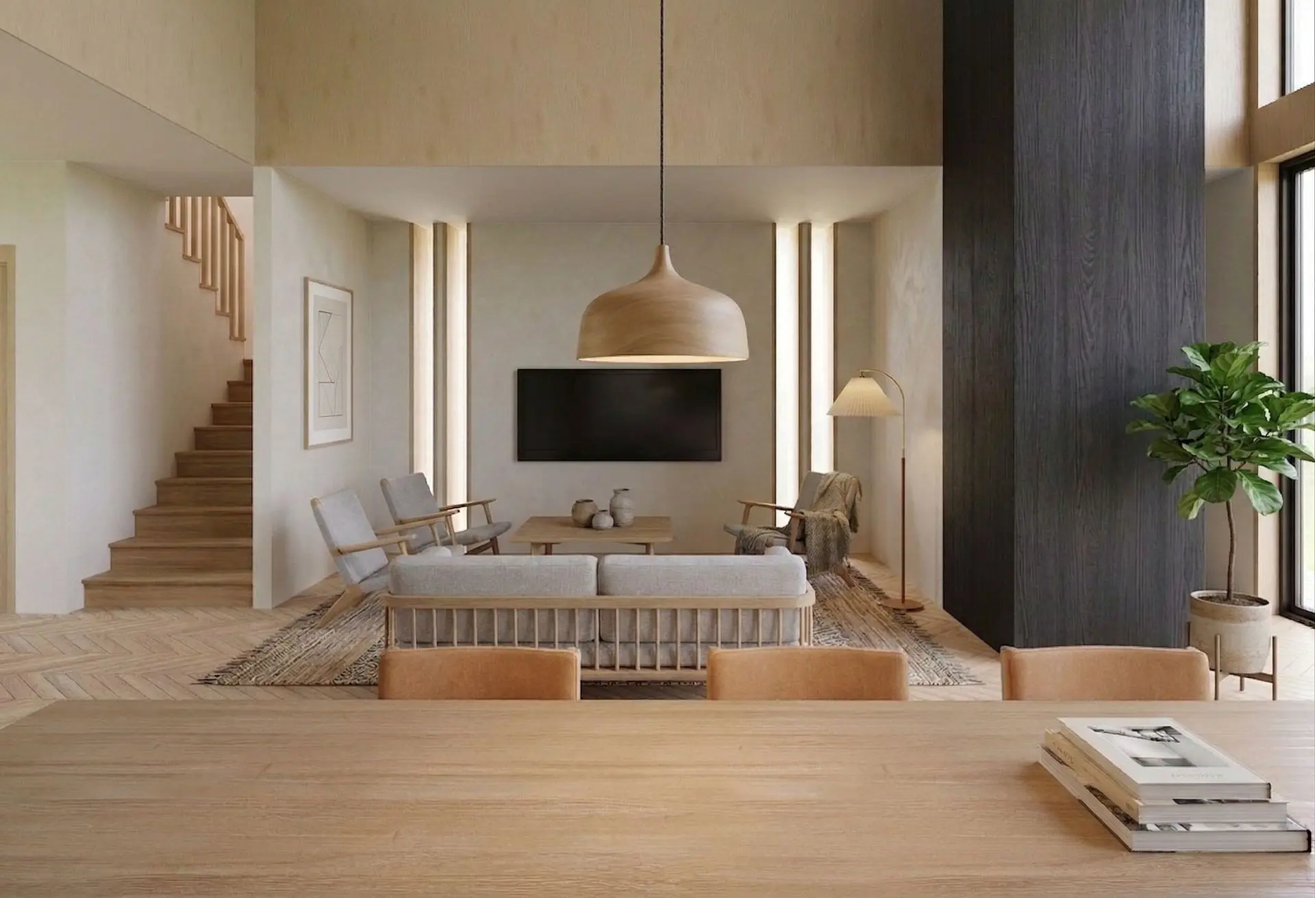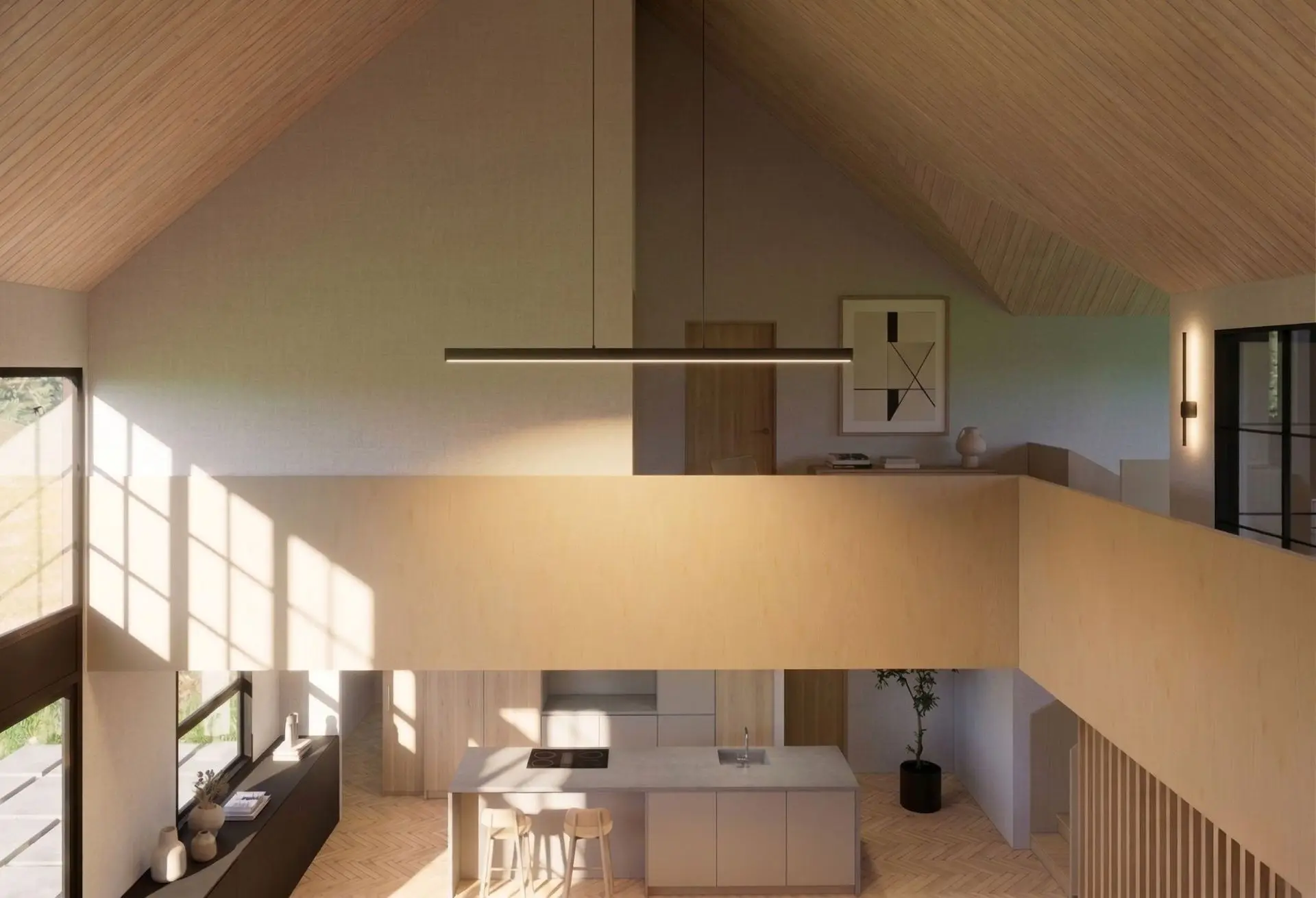 Expansive aluminum-framed glass panels introduce transparency and light, while thermally treated wood is used for outdoor decks and terraces. This combination of materials creates a durable, low-maintenance exterior with a strong visual presence, perfectly suited for modern mountain villa.