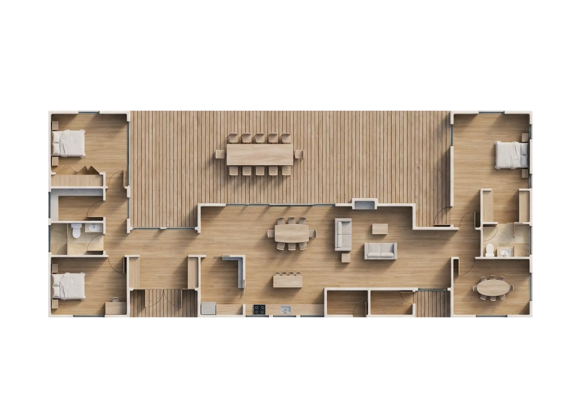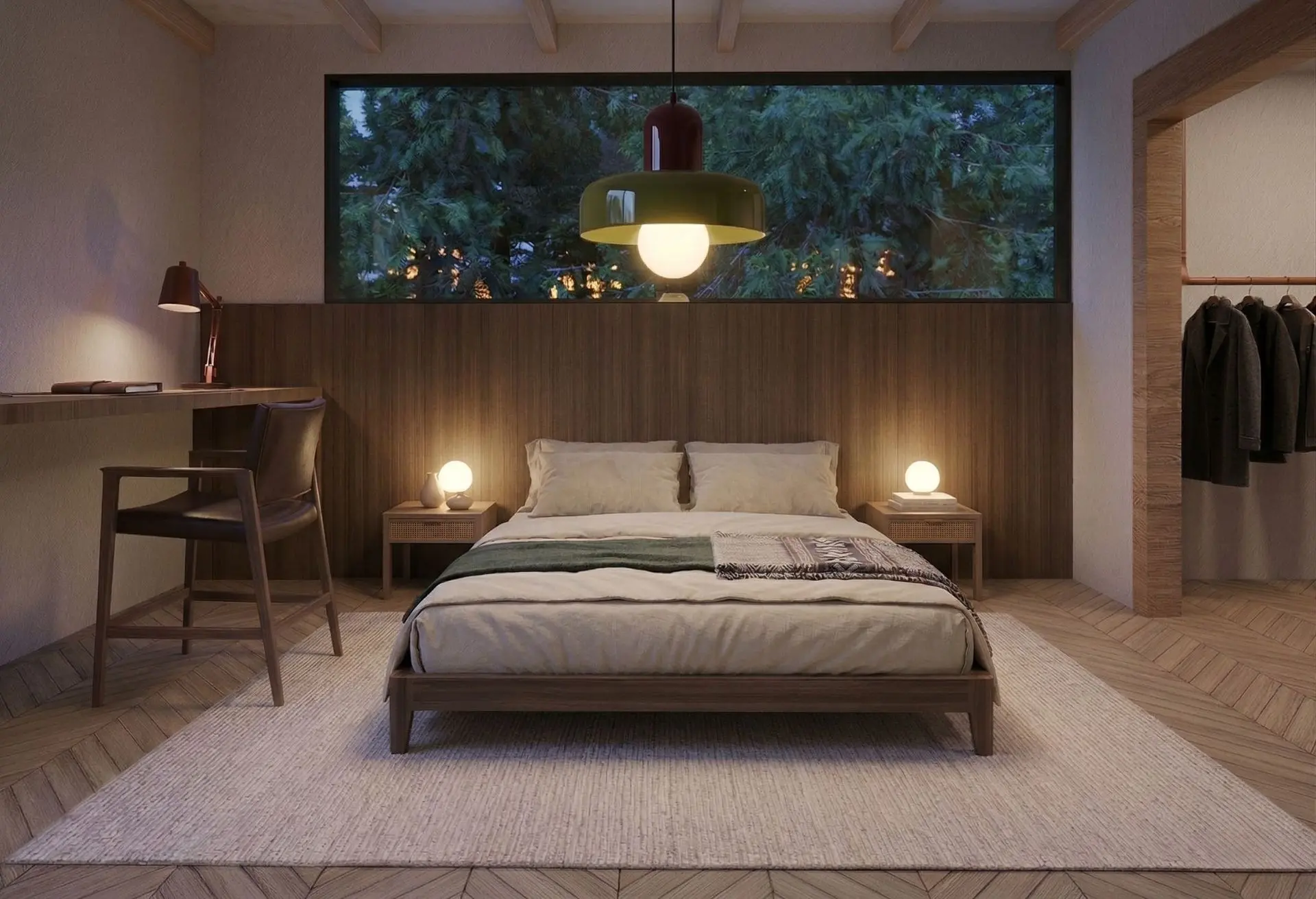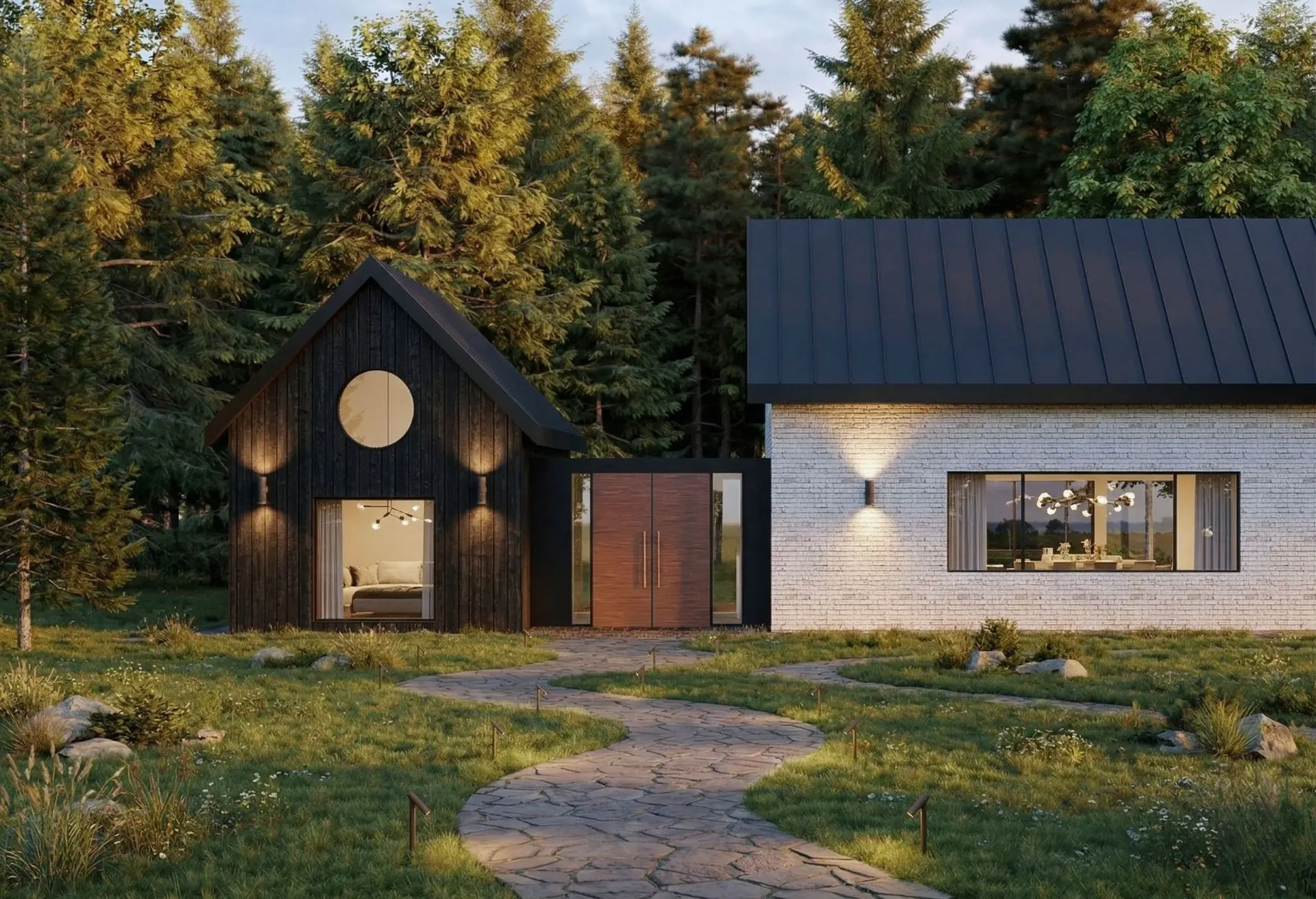 The home’s facade is a dynamic interplay of textures and tones. The pitched roof is clad in sleek, standing seam dark grey metal sheets. The primary exterior walls feature a striking combination of thermally treated light wood panels and brick siding. Adding an industrial touch, corten steel sheets line the passage walls. High-quality aluminum profile tempered glass is used for the expansive windows and sliding doors, while the outdoor decks utilize thermally treated wood panels supported by a pressure-treated lumber structure.
