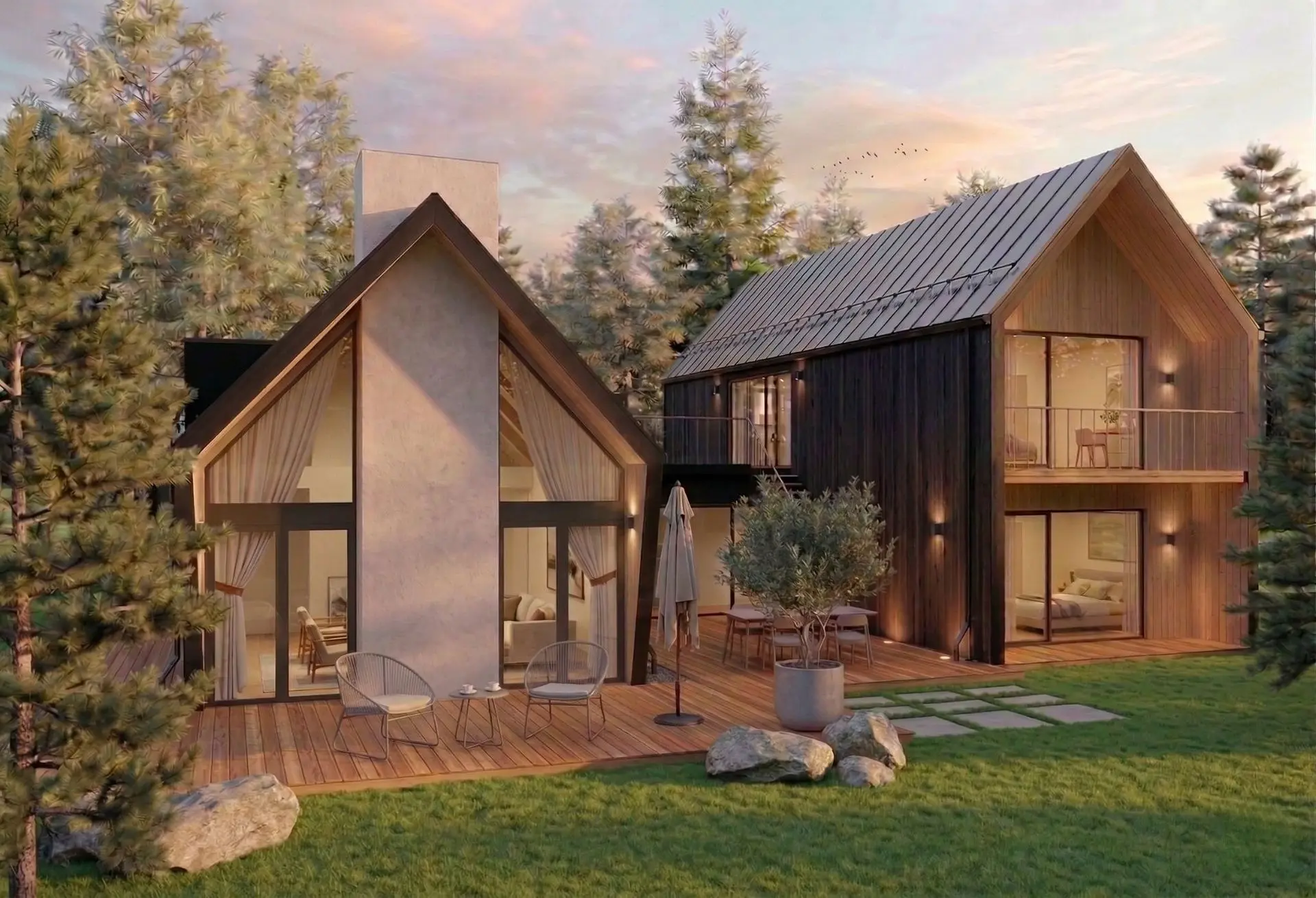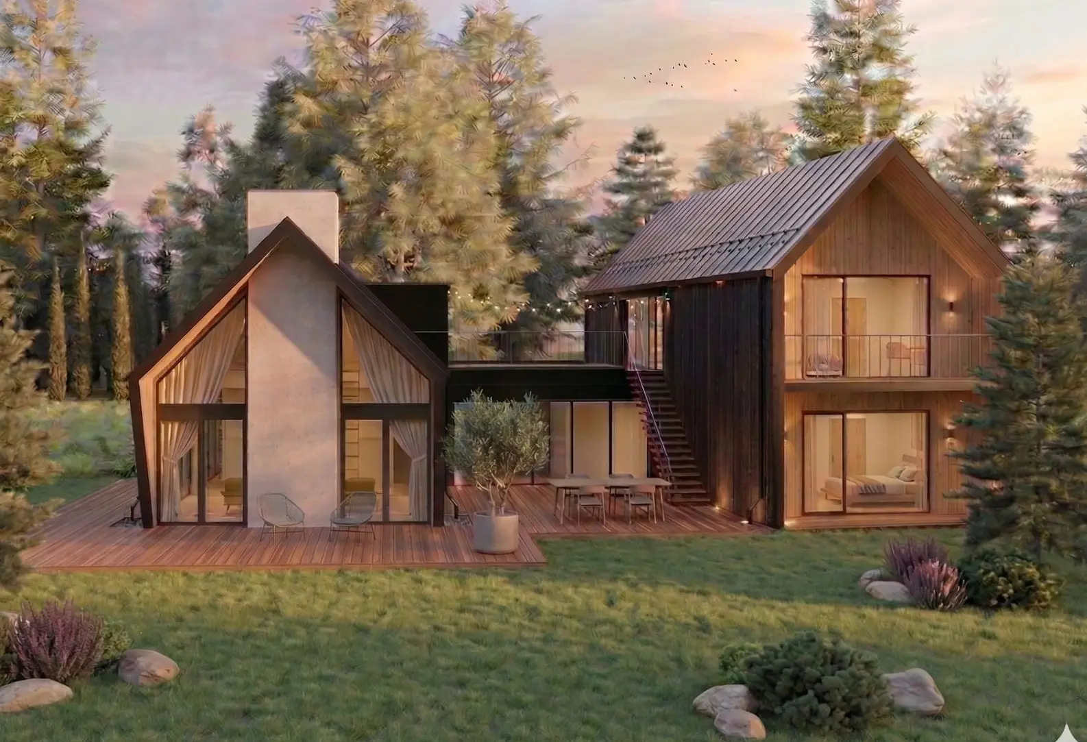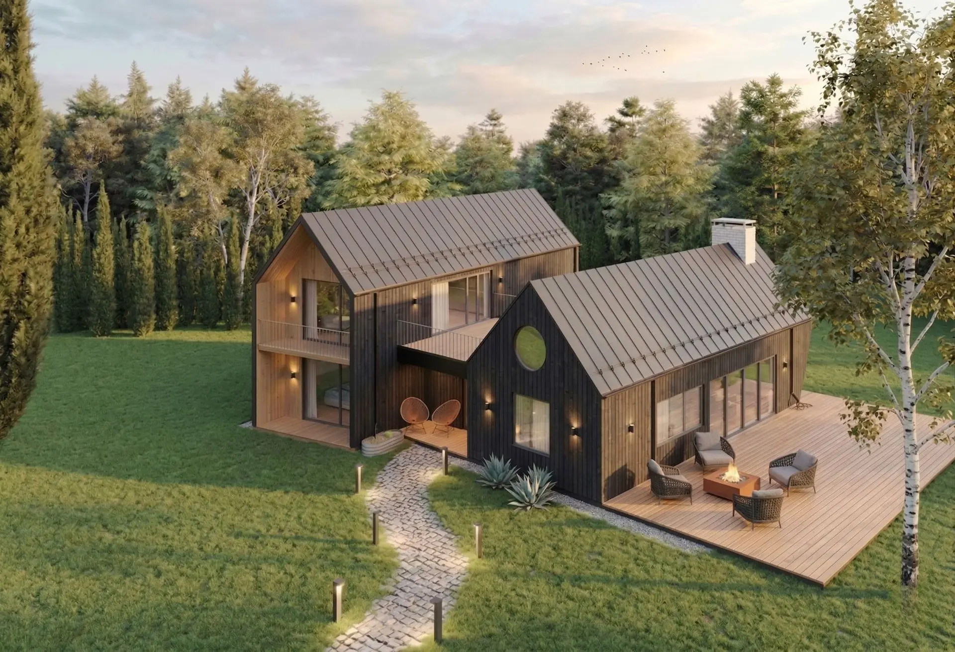 V House utilizes a refined palette of modern, durable materials that complement its natural surroundings. The exterior features a black standing-seam metal roof, expansive aluminum-framed glass panels, and thermally treated wood surfaces that add warmth and texture to the architectural composition.